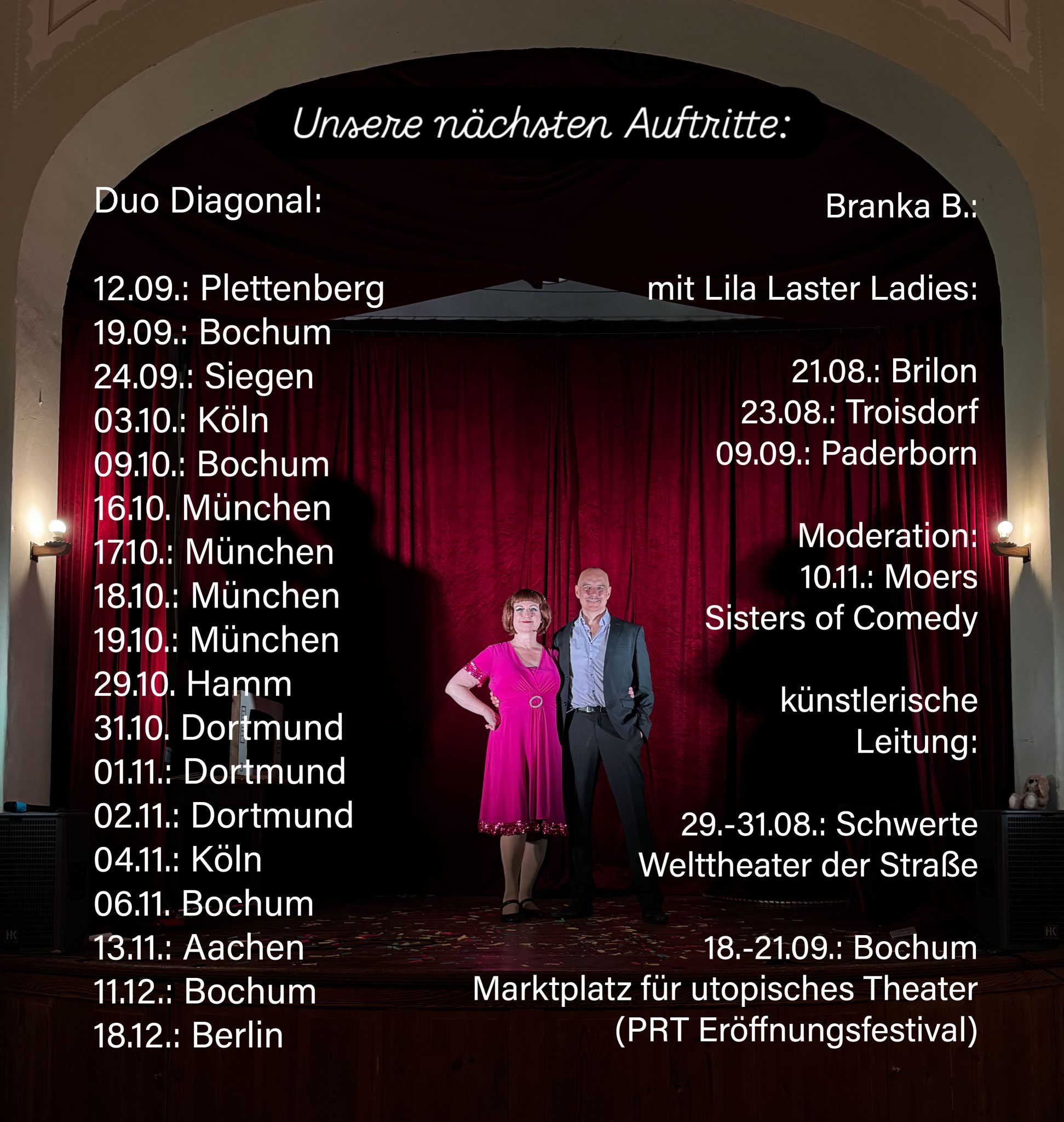 Seit 1999 sind Deana und Holger Ehrich mit ihren Bühnen- und OpenAir-Programmen auf Tour, mit über 2000 Shows von Tuttlingen bis Tokio, Hamburg bis HongKong. Ob auf internationale Festivals, renommierte Kabarettbühnen oder in undergroundigen Comedy Clubs – stets trifft Eleganz auf gekonnten Unfug.